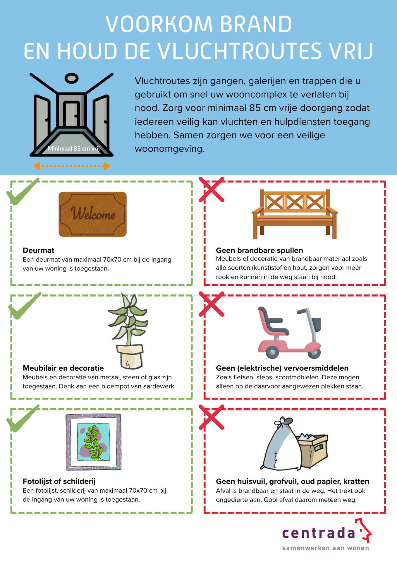 Geen brandbare spullen in de vluchtroutes